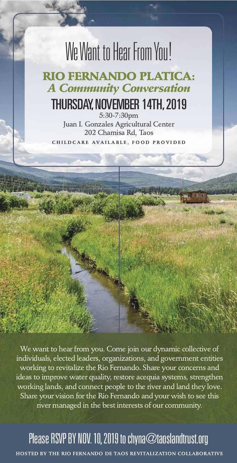 We want to hear from you.  Come join our dynamic collective of individuals, elected leaders, organizations, and governments entities working to revitalize the Rio Fernando. Share your concerns and ideas to improve water quality, restore acequia systems, strengthen working lands, and connect people to the river and land they love. Share your vision for the Rio Fernando and your wish to see this river managed in the best interests of our community.